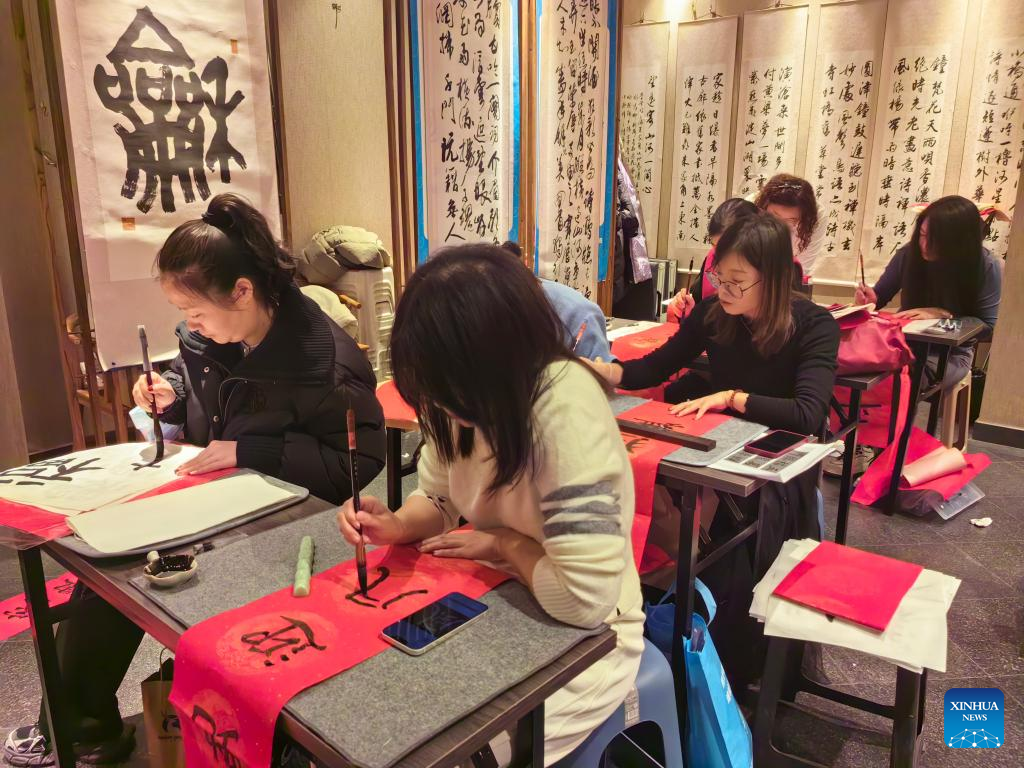 People learn Chinese calligraphy at a night school in Taiyuan, north China's Shanxi Province, Jan. 11, 2025. (Xinhua/Li Ziwei)