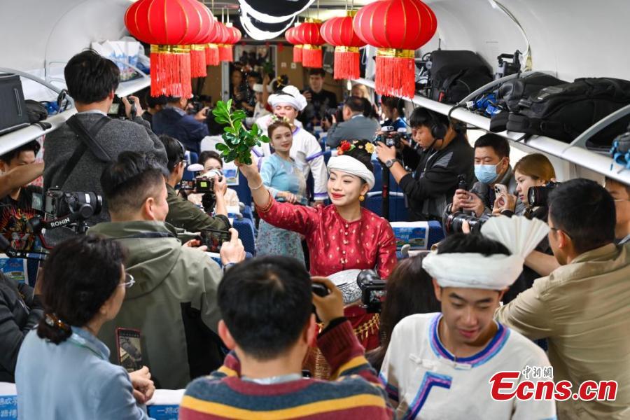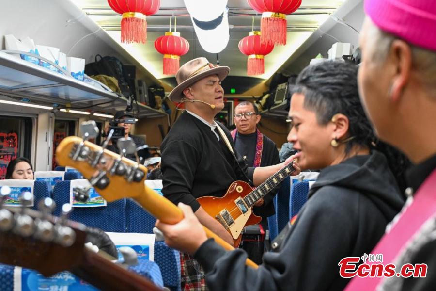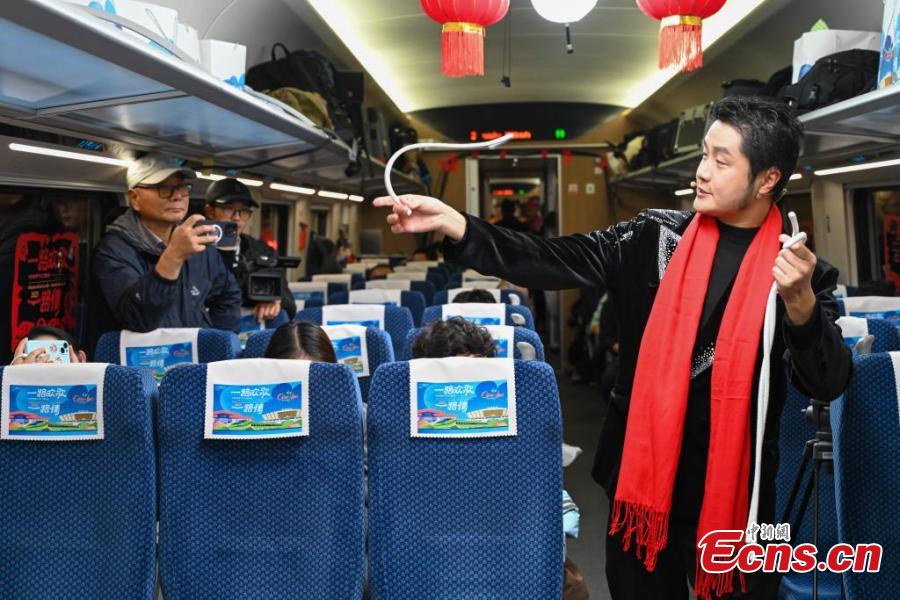Artists perform to greet the upcoming Spring Festival on the China-Laos cross-border train D87, Jan. 14, 2025. (Photo: China News Service/Li Jiaxian)