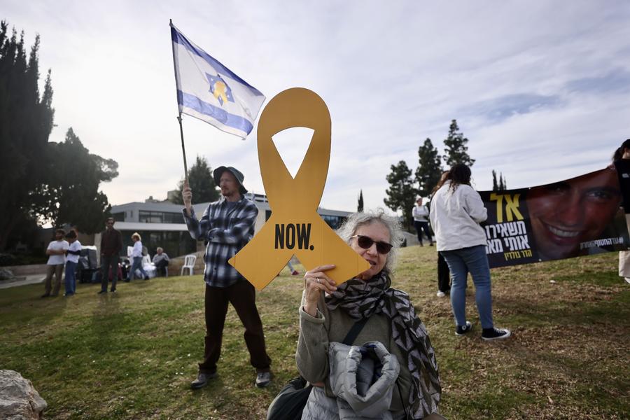 Relatives and supporters of hostages held in the Gaza Strip rally outside Israeli Prime Minister's office in Jerusalem, on Jan. 14, 2025. (Photo by Jamal Awad/Xinhua)