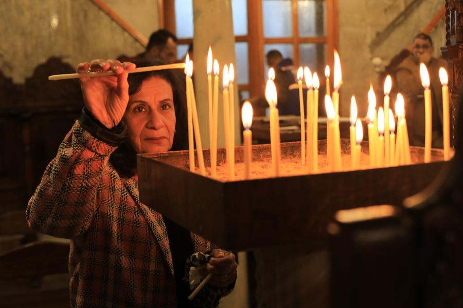 A Palestinian Christian lights a candle during an Orthodox Christmas mass at the Saint Porphyrius Church in Gaza City, Jan 7, 2025. (Photo by Mahmoud Zaki/Xinhua)