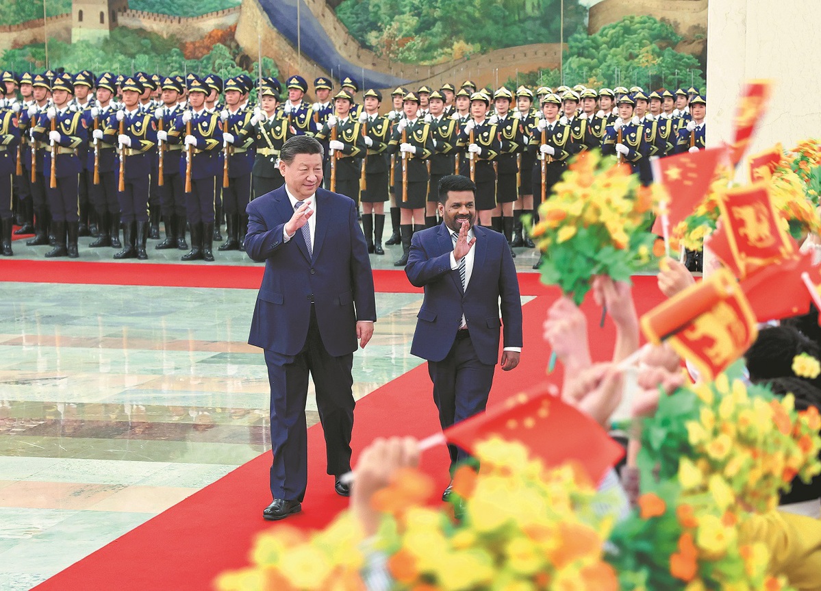 President Xi Jinping hosts a welcoming ceremony for visiting Sri Lankan President Anura Kumara Dissanayake before their talks at the Great Hall of the People in Beijing on Wednesday. (Yao Dawei/Xinhua)