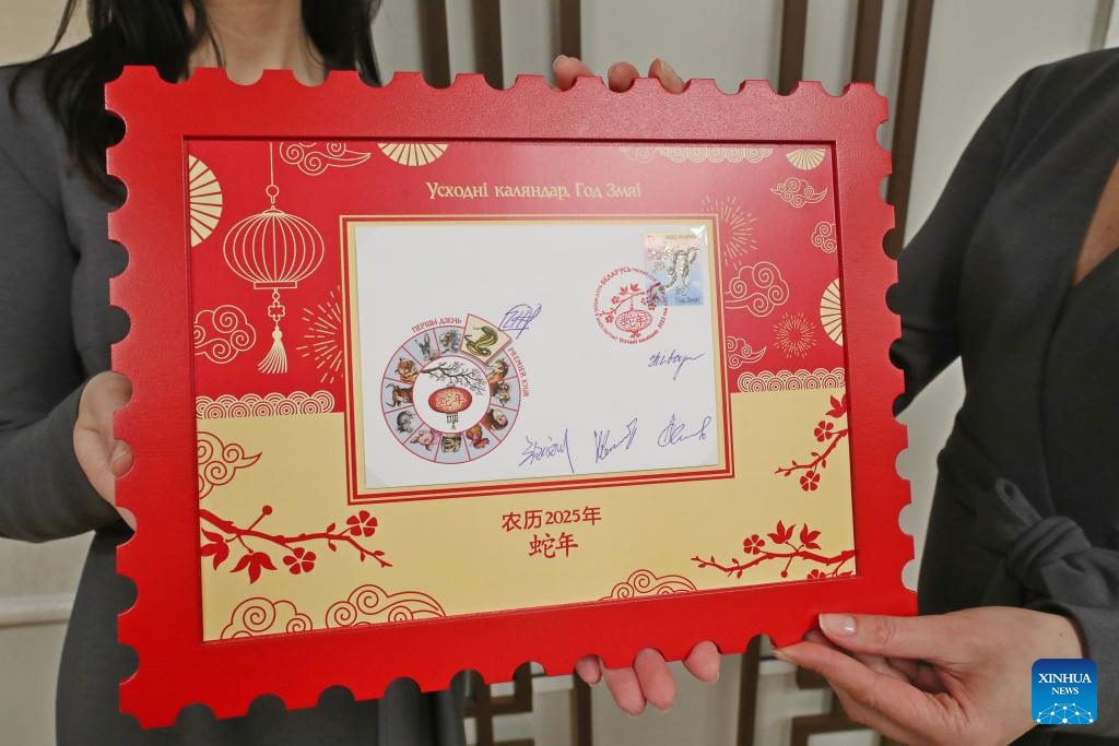 Staff members show the first-day cover of the postage stamps for the "Year of the Snake" from the "Eastern Calendar" series in Minsk, Belarus, Jan. 15, 2025. The set of six stamps, titled "Eastern Calendar: Year of the Snake," consists of an image of a snake in the center. The lower right corner features the Chinese word for "Snake" along with the phrase "Year of the Snake" written in Belarusian. (Photo by Henadz Zhinkov/Xinhua)