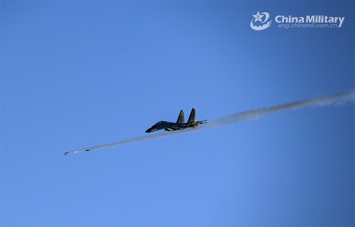A J-16 multi-role fighter jet attached to an aviation regiment under the Chinese PLA Air Force fires at simulated target during a live-fire training exercise on December 12, 2024. (eng.chinamil.com.cn/Photo by Xu Chengcheng)