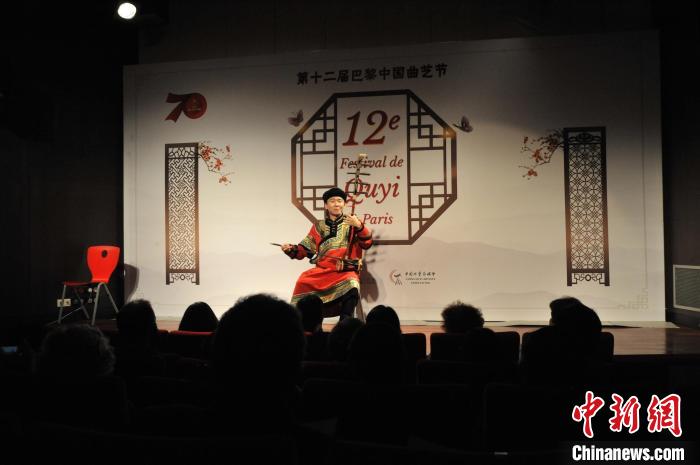Photo taken in 2019 shows Li Gegenzhuge, a sixth-generation inheritor of traditional Mongolian storytelling folk art Uliger, performing Uliger in Paris, France, at an event marking the 55th anniversary of the establishment of diplomatic relations between China and France. (Photo courtesy of the interviewee)