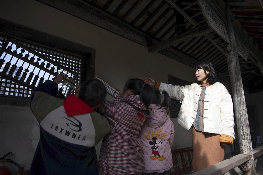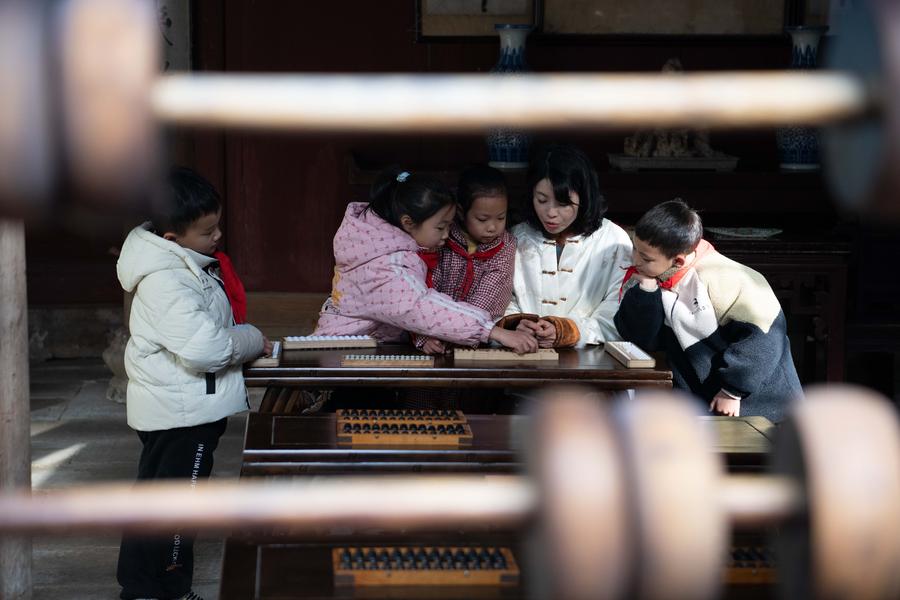 Wang Suqiu teaches abacus knowledge to students at Cheng Dawei Abacus Museum in Tunxi District, Huangshan, east China's Anhui Province, Jan. 9, 2025. (Xinhua/Zhang Duan)