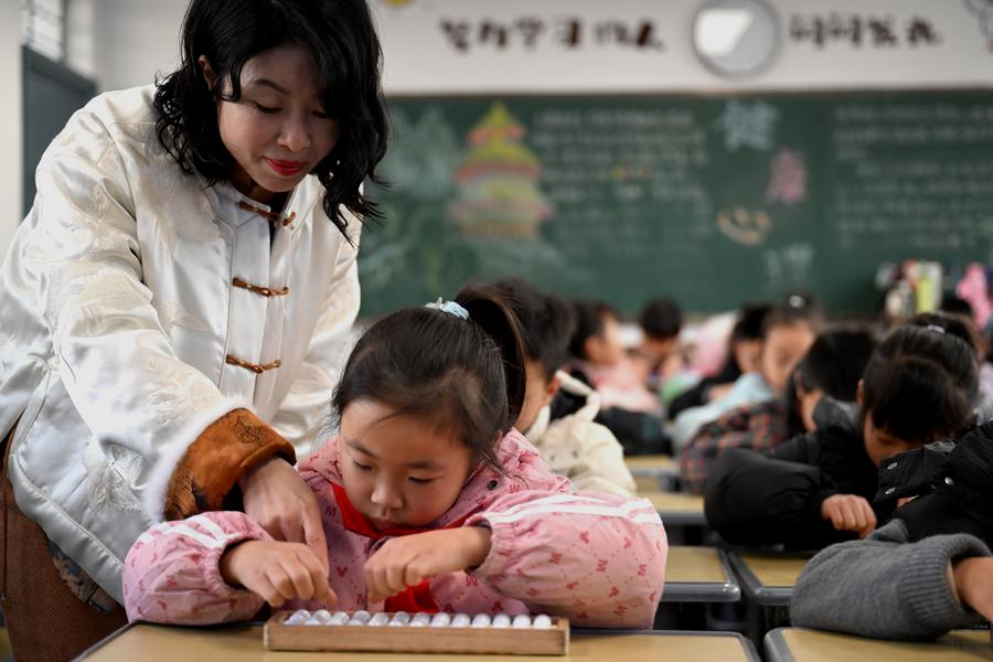 TUNXI, Jan. 16 (Xinhua) -- Wang Suqiu is a math teacher and abacus trainer at Dawei Primary School in Tunxi District of Huangshan, east China's Anhui Province. She is also an inheritor of China's national intangible cultural heritage of abacus calculation. In 1998, she started to integrate traditional abacus culture into her math classes for lower-grade elementary school students. In doing so, Wang developed a unique teaching style which has helped stimulate students' interest in learning math.