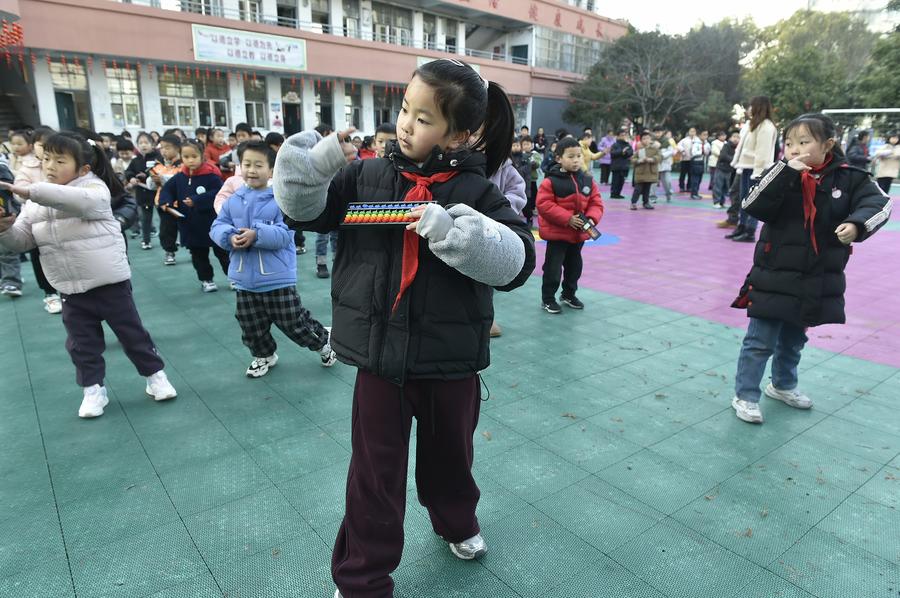 Students do an abacus-themed morning exercise at Dawei Primary School in Tunxi District, Huangshan, east China's Anhui Province, Jan. 9, 2025. (Xinhua/Lu Peng)