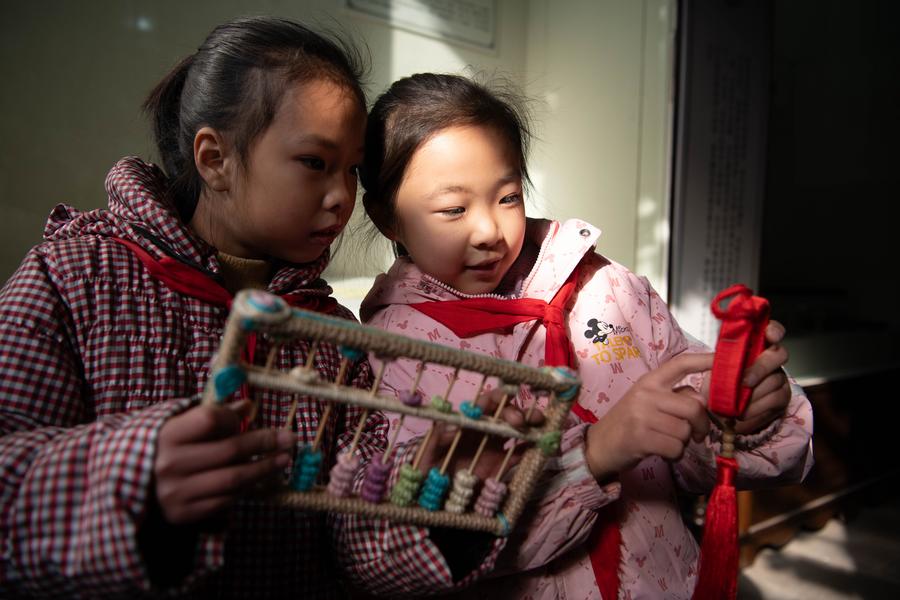 Primary school students show a handmade abacus at Cheng Dawei Abacus Museum in Tunxi District, Huangshan, east China's Anhui Province, Jan. 9, 2025. (Xinhua/Zhang Duan)