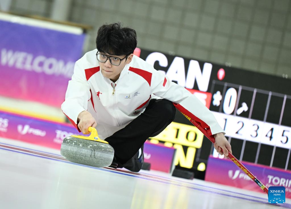 Yu Sen of China competes during the curling men's round robin session match between China and Canada at the Torino 2025 FISU World University Winter Games in Turin, Italy, Jan. 16, 2025. (Xinhua/He Canling)