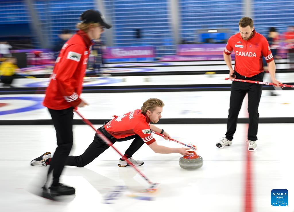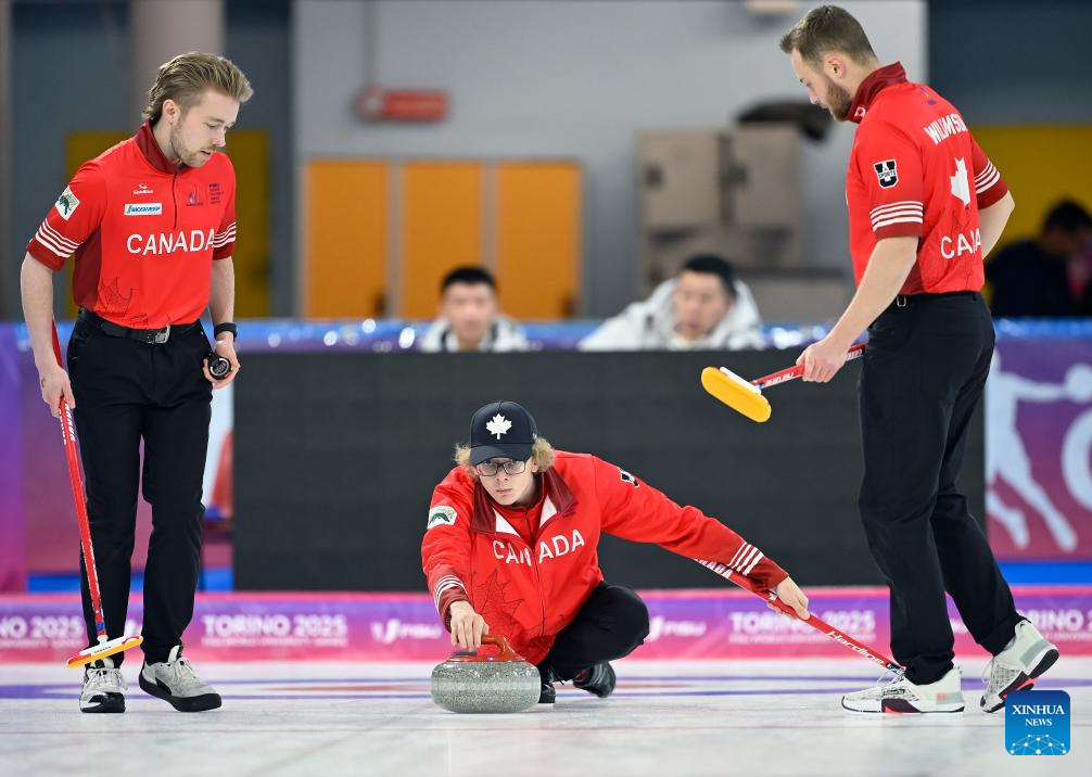 Ayden Whittmire (C) of Canada competes during the curling men's round robin session match between China and Canada at the Torino 2025 FISU World University Winter Games in Turin, Italy, Jan. 16, 2025. (Xinhua/He Canling)