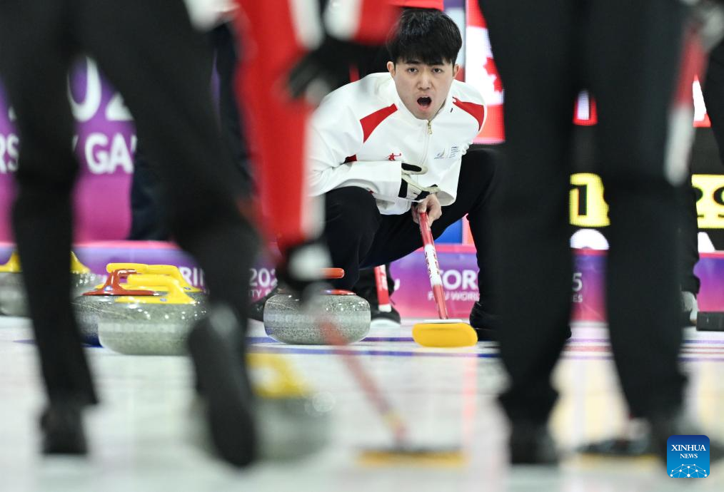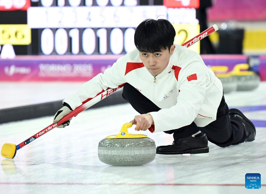 Hou Fuqiang of China competes during the curling men's round robin session match between China and Canada at the Torino 2025 FISU World University Winter Games in Turin, Italy, Jan. 16, 2025. (Xinhua/He Canling)