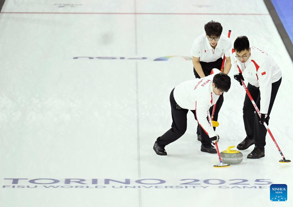 Liang Zhengzhao (C) of China watches as his teammate Hou Fuqiang (L) sweeps during the curling men's round robin session match between China and Canada at the Torino 2025 FISU World University Winter Games in Turin, Italy, Jan. 16, 2025. (Xinhua/He Canling)