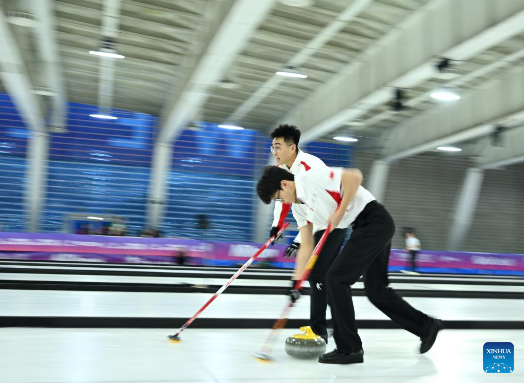 Liang Zhengzhao (back) and Yu Sen of China sweep during the curling men's round robin session match between China and Canada at the Torino 2025 FISU World University Winter Games in Turin, Italy, Jan. 16, 2025. (Xinhua/He Canling)