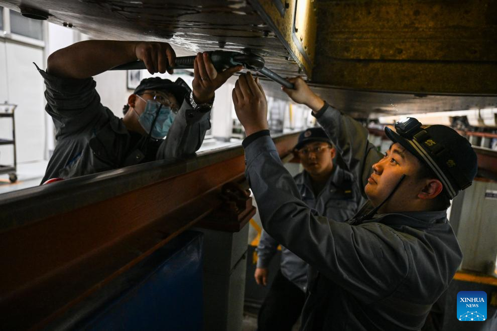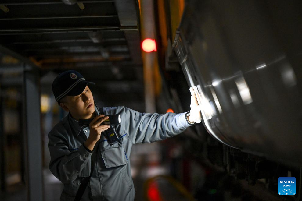 A technician inspects a bullet train carriage at a train depot in Hohhot, north China's Inner Mongolia Autonomous Region, Jan. 17, 2025.