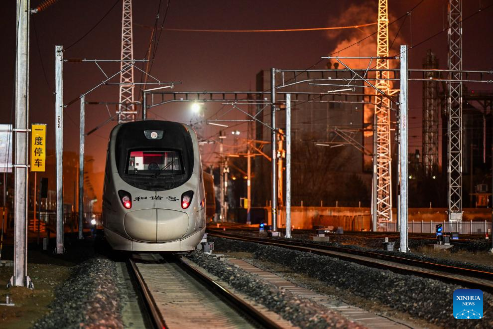 A bullet train leaves a train depot after maintenance in Hohhot, north China's Inner Mongolia Autonomous Region, Jan. 17, 2025.