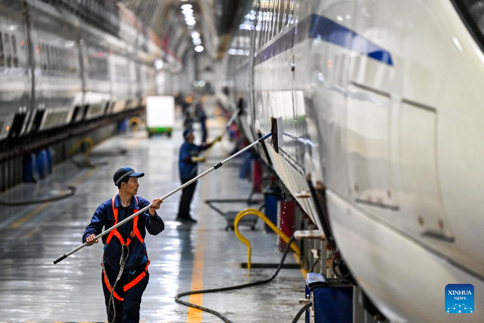 A staff member cleans the surface of a bullet train at a train depot in Hohhot, north China's Inner Mongolia Autonomous Region, Jan. 17, 2025.