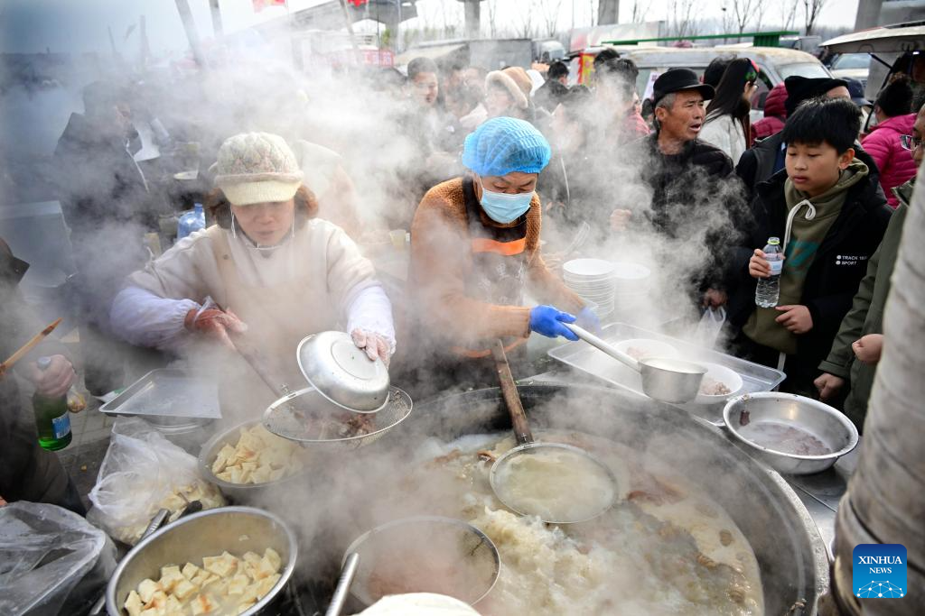 People buy local delicacy at the Poli Market in Qingdao Xihai'an (West Coast) New Area in Qingdao, east China's Shandong Province, Jan. 18, 2025. With a history of more than 300 years, the Poli Market is a local intangible cultural heritage and one of the biggest traditional markets in eastern Shandong Province. As the Spring Festival approaches, many visitors flock to the market for abundant new year decorations, agricultural products, local delicacies and so on. (Xinhua/Li Ziheng)