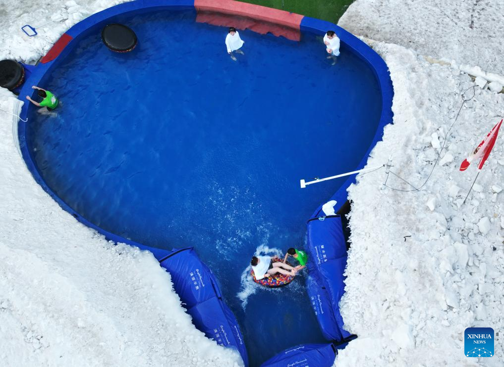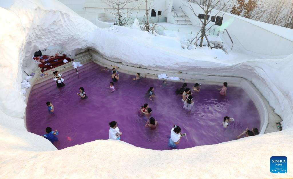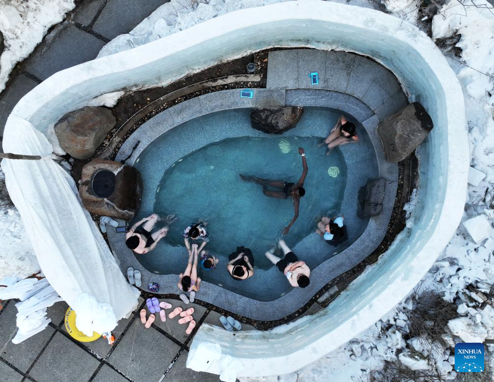 Visitors enjoy themselves in a hot spring pool surrounded by ice and snow at a hot spring resort in Shenyang, northeast China's Liaoning Province, Jan. 17, 2025. (Xinhua/Yang Qing)
