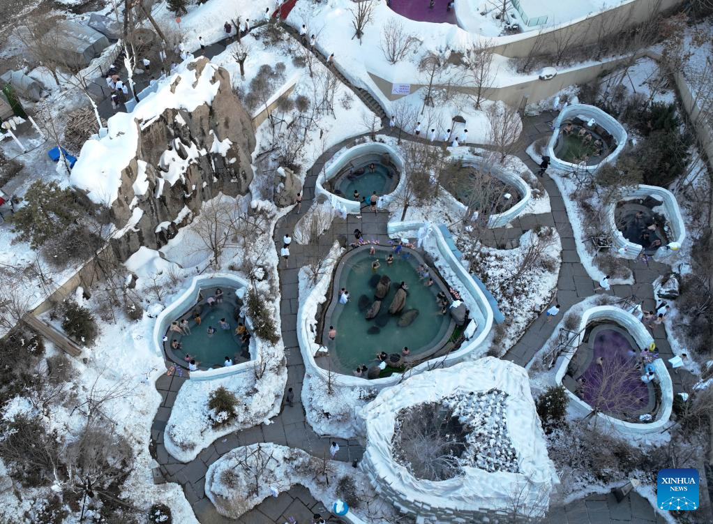 An aerial drone photo shows visitors enjoying themselves in hot spring pools surrounded by ice and snow at a hot spring resort in Shenyang, northeast China's Liaoning Province, Jan. 17, 2025. (Xinhua/Li Gang)