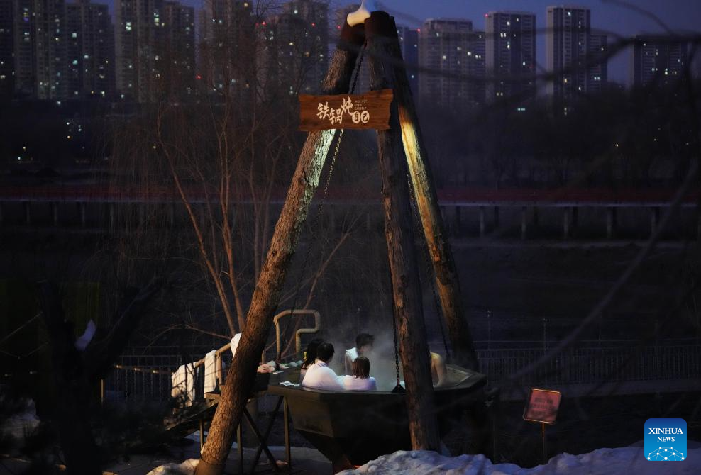 Visitors enjoy a hot bath in a giant iron pot at a hot spring resort in Shenyang, northeast China's Liaoning Province, Jan. 17, 2025. (Xinhua/Li Gang)