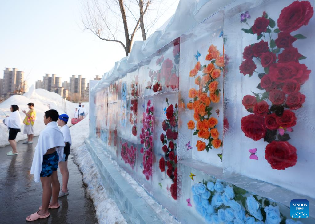 Visitors pose for photos with flowers encased in an ice wall at a hot spring resort in Shenyang, northeast China's Liaoning Province, Jan. 17, 2025. (Xinhua/Li Gang)