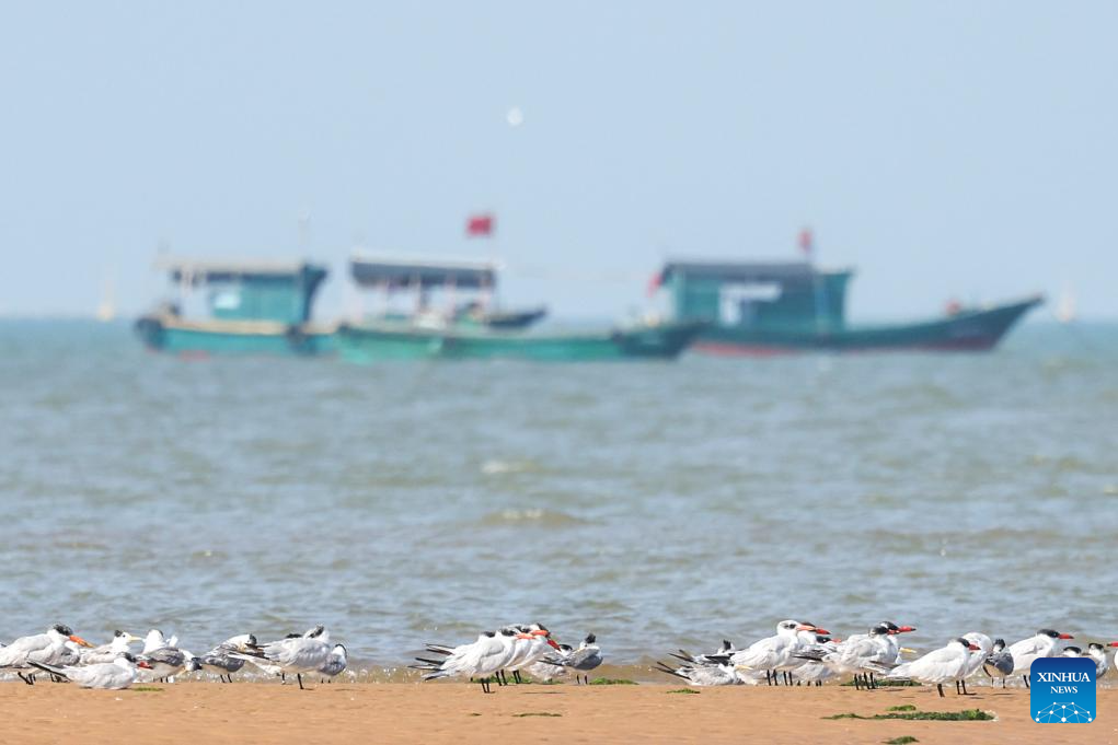 This photo taken on Jan. 18, 2025 shows migrant birds on a beach in Danzhou City, south China's Hainan Province. The ecological environment in Hainan has been improving in recent years thanks to the protection of wetlands and birds by the local government, attracting an increasing number of migrant birds wintering here. (Xinhua/Zhang Liyun)