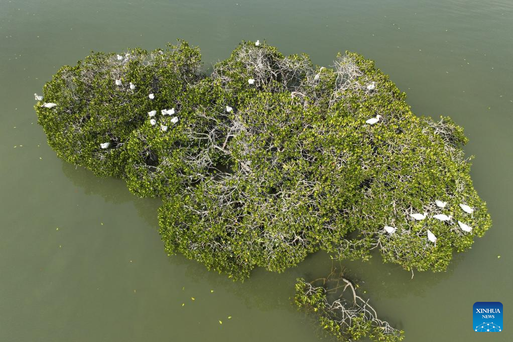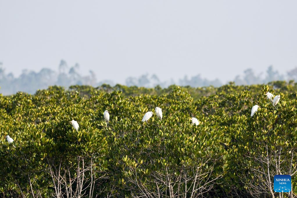 This photo taken on Jan. 18, 2025 shows cattle egrets at the Hainan Xinying Mangrove National Wetland Park in Danzhou City, south China's Hainan Province. The ecological environment in Hainan has been improving in recent years thanks to the protection of wetlands and birds by the local government, attracting an increasing number of migrant birds wintering here. (Xinhua/Zhang Liyun)