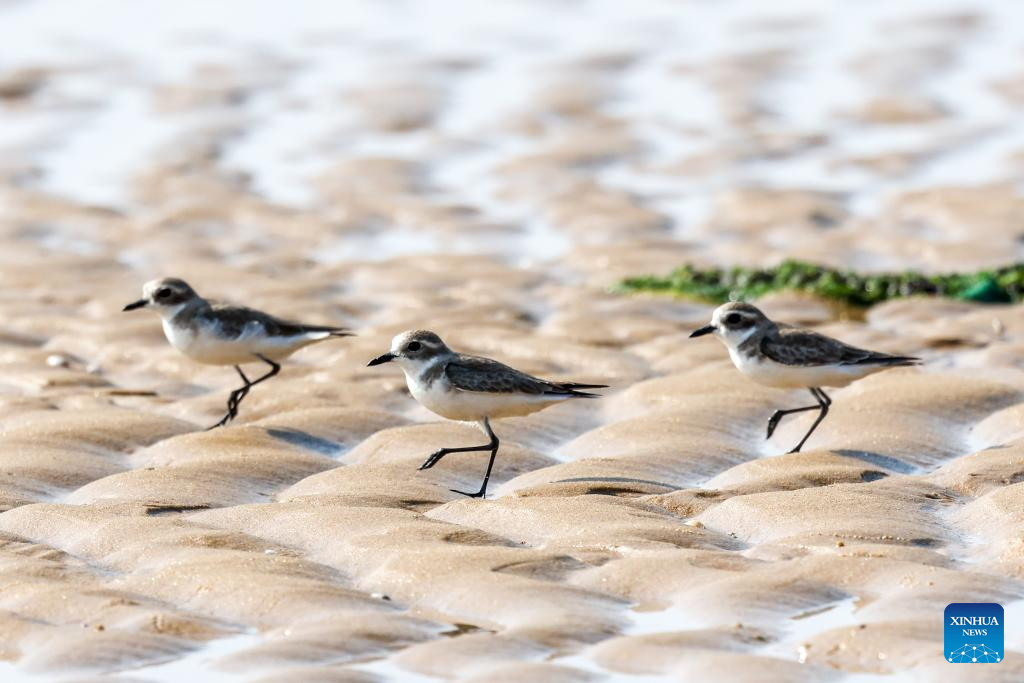 This photo taken on Jan. 18, 2025 shows lesser sand plovers on a beach in Danzhou City, south China's Hainan Province. The ecological environment in Hainan has been improving in recent years thanks to the protection of wetlands and birds by the local government, attracting an increasing number of migrant birds wintering here. (Xinhua/Zhang Liyun)