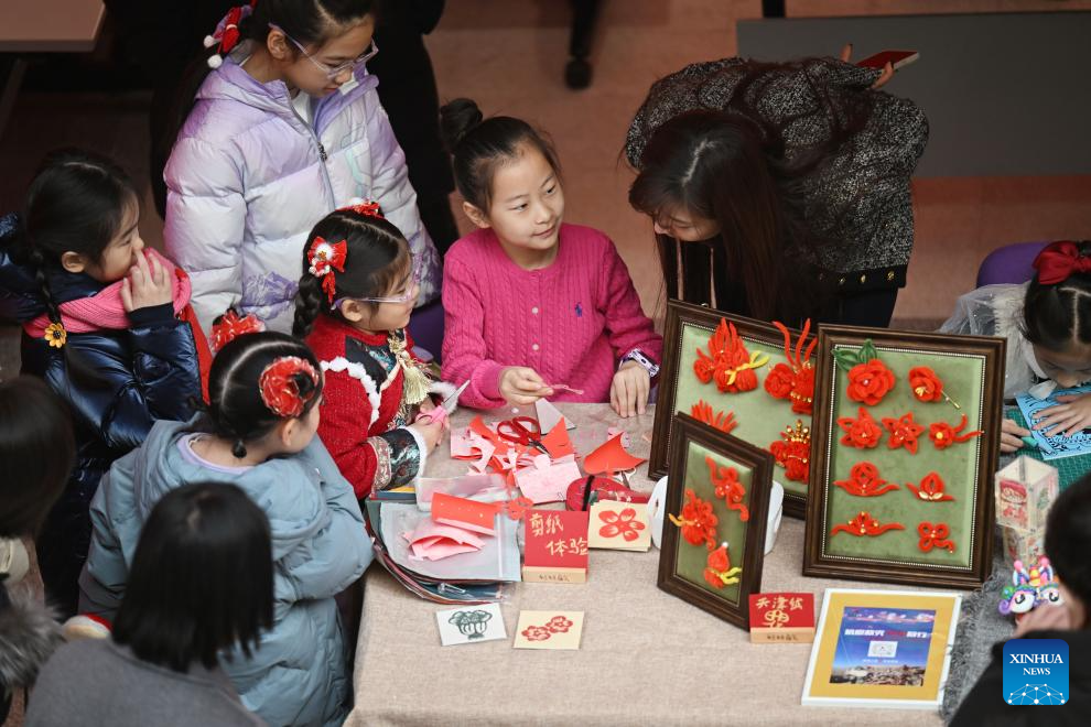 Children experience paper-cutting during a children's temple fair at the Youth and Children's Center in north China's Tianjin, Jan. 18, 2025. The three-day children's event kicked off on Saturday in Tianjin to welcome the Chinese Lunar New Year by showcasing intangible cultural heritage folklore, performances and traditional food. (Xinhua/Li Ran)