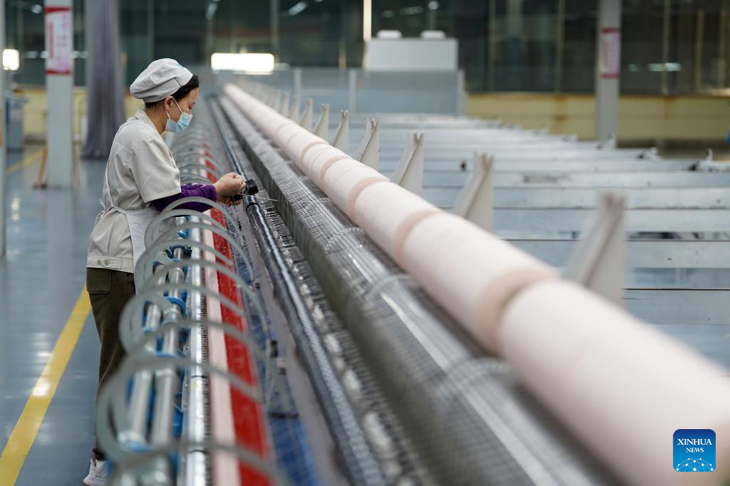 A staff member works at the cashmere yarn production workshop of a cashmere products manufacturer in Qinghe County, Xingtai City, north China's Hebei Province, Jan. 18, 2025. Cashmere products manufacturers in Qinghe County are busy with production for orders before the upcoming Spring Festival holidays. Qinghe County is a renowned cashmere raw material processing and distribution center, cashmere spinning base and an important production and marketing base of cashmere products in China. (Xinhua/Mu Yu)