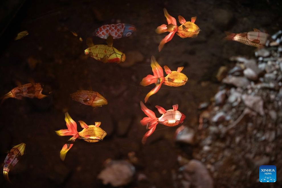 This photo shows the reflection of fish-shaped lanterns at Zhanqi Village in Shexian County of Huangshan City, east China's Anhui Province, Jan. 10, 2025. (Xinhua/Zhang Duan)