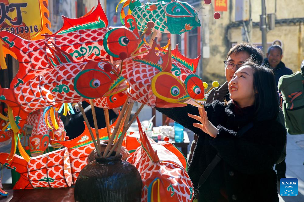 Tourists select fish-shaped lanterns at Zhanqi Village in Shexian County of Huangshan City, east China's Anhui Province, Jan. 10, 2025. (Xinhua/Zhang Duan)