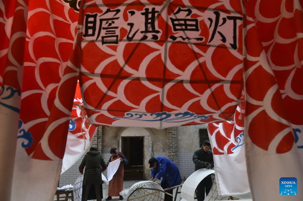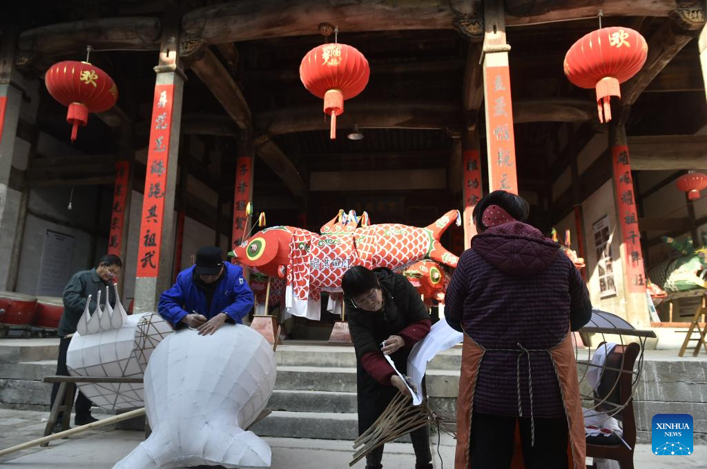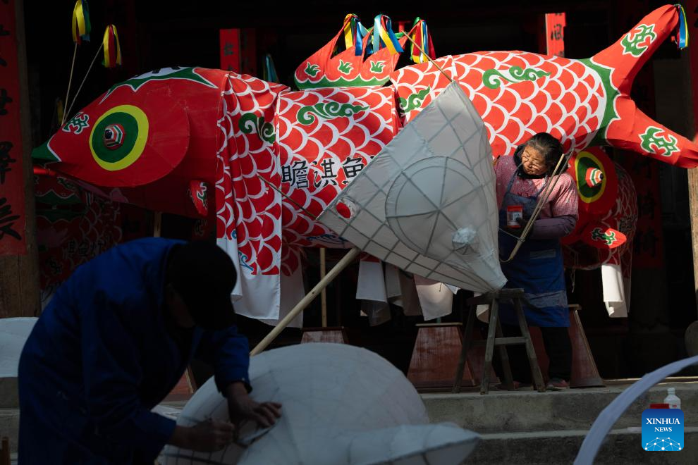Villagers make fish-shaped lanterns at Zhanqi Village in Shexian County of Huangshan City, east China's Anhui Province, Jan. 6, 2025. (Xinhua/Lu Peng)
