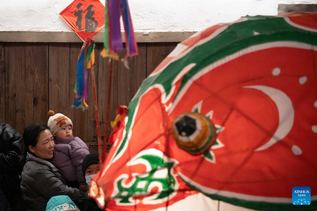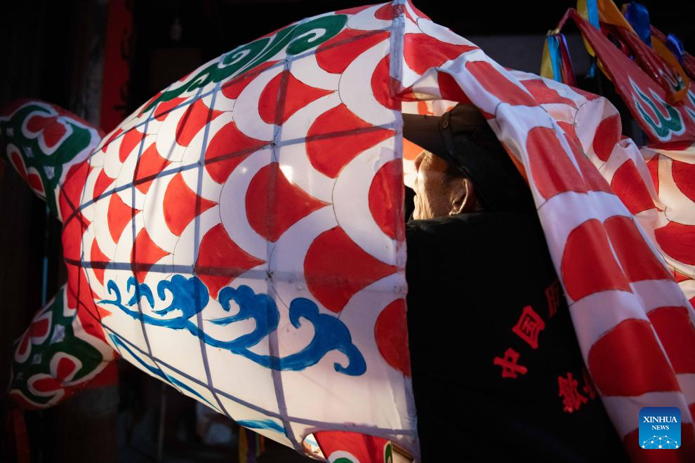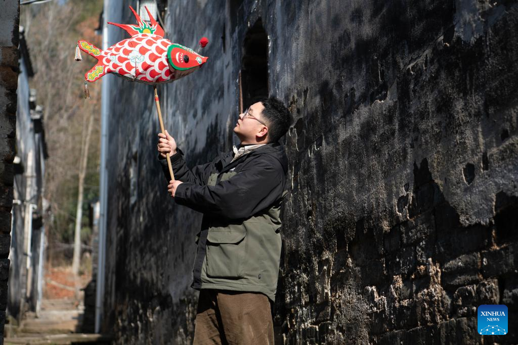 A villager lights up a fish-shaped lantern at Zhanqi Village in Shexian County of Huangshan City, east China's Anhui Province, Jan. 8, 2025. (Xinhua/Zhang Duan)