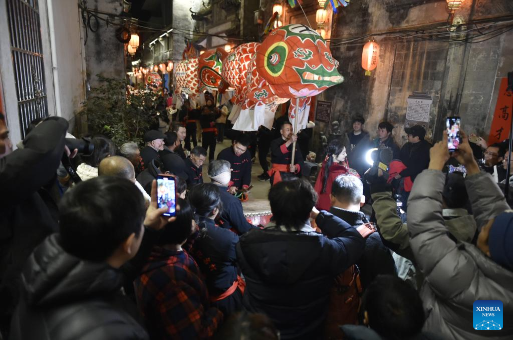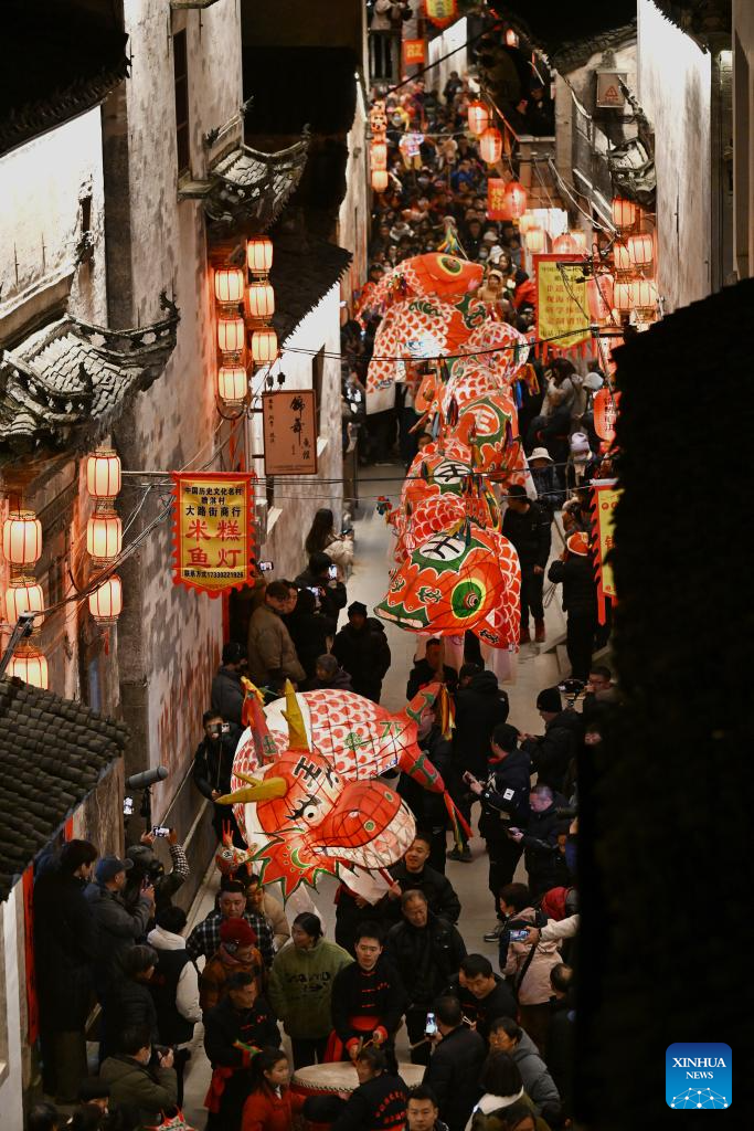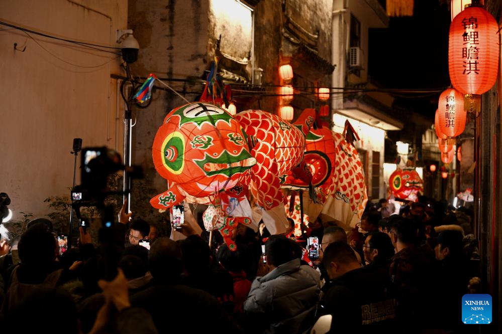 A fish-shaped lantern performing team parades at Zhanqi Village in Shexian County of Huangshan City, east China's Anhui Province, Jan. 10, 2025. (Xinhua/Huang Bohan)