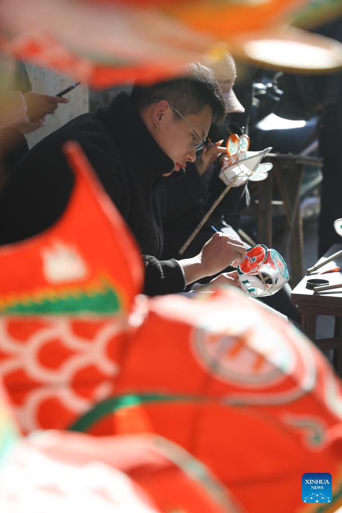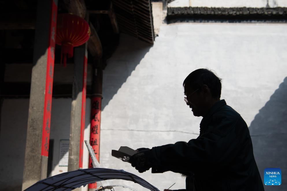 A craftsman makes a fish-shaped lantern at Zhanqi Village in Shexian County of Huangshan City, east China's Anhui Province, Jan. 18, 2025. (Photo by Fan Chengzhu/Xinhua)