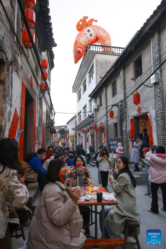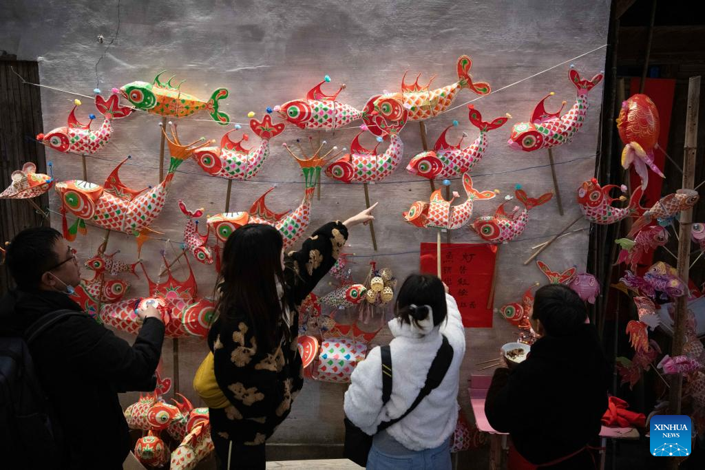 Tourists select fish-shaped lanterns at Zhanqi Village in Shexian County of Huangshan City, east China's Anhui Province, Jan. 18, 2025. (Photo by Fan Chengzhu/Xinhua)
