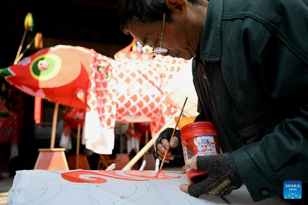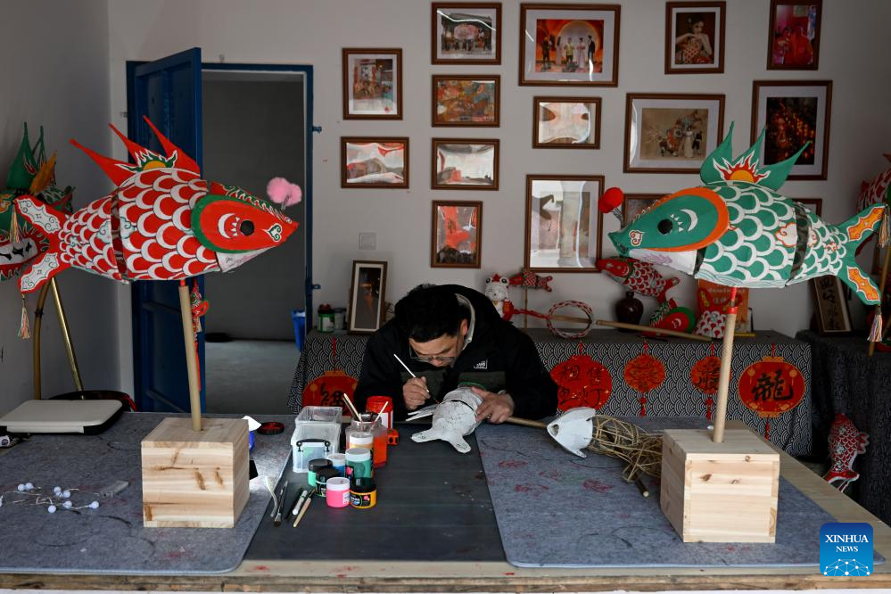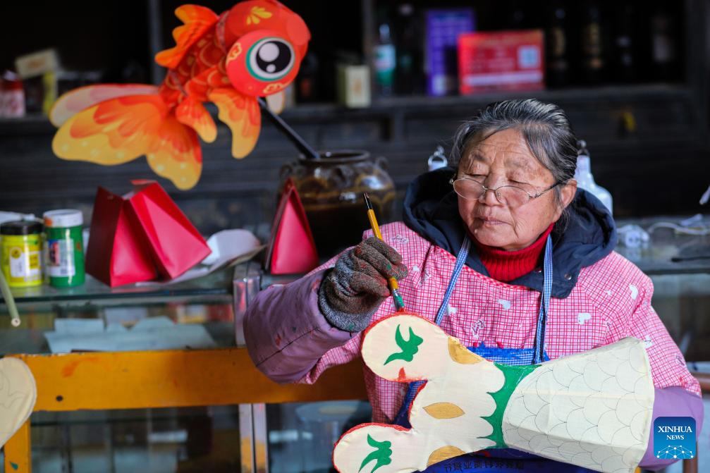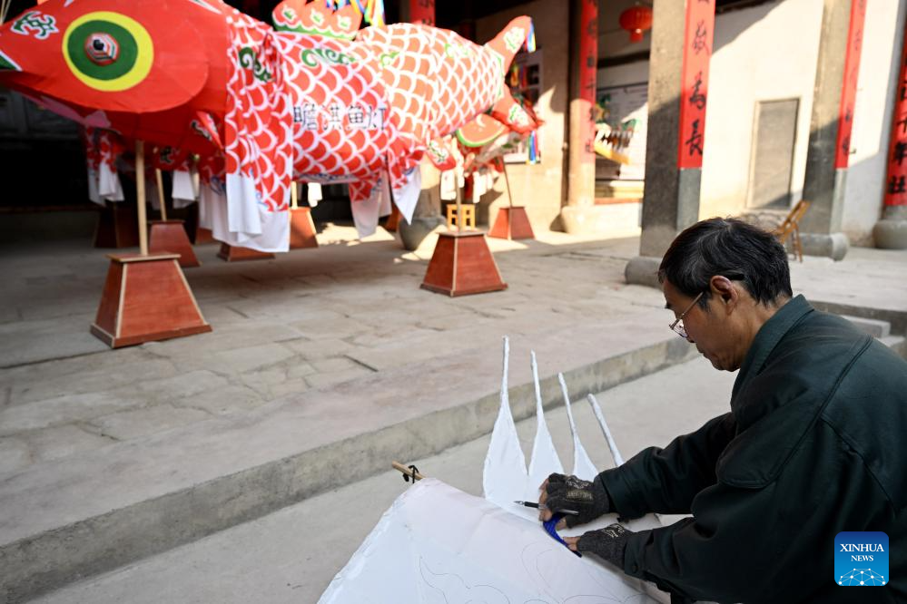 A villager makes a fish-shaped lantern at Zhanqi Village in Shexian County of Huangshan City, east China's Anhui Province, Jan. 18, 2025. (Photo by Fan Chengzhu/Xinhua)