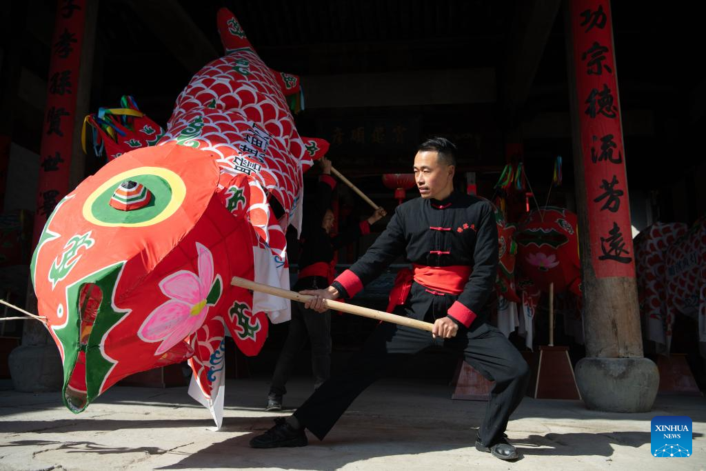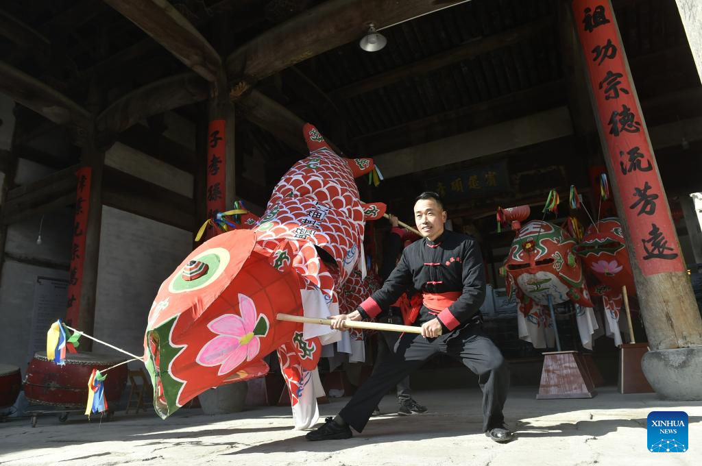 The captain of a fish-shaped lantern performing team performs a dance with fish-shaped lantern at Zhanqi Village in Shexian County of Huangshan City, east China's Anhui Province, Jan. 6, 2025. (Xinhua/Zhang Duan)