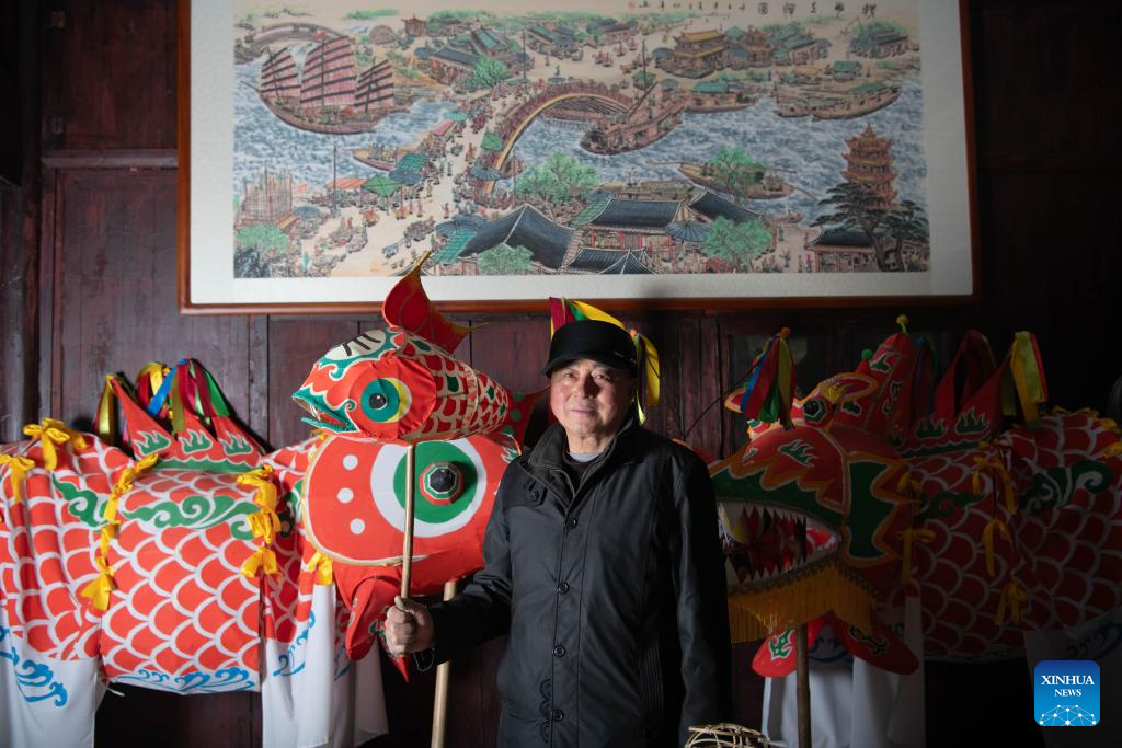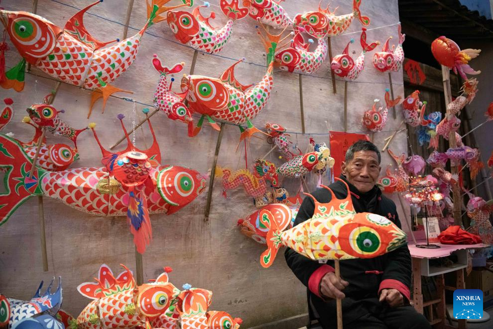 A craftsman displays his fish-shaped lanterns at Zhanqi Village in Shexian County of Huangshan City, east China's Anhui Province, Jan. 6, 2025. (Xinhua/Zhang Duan)