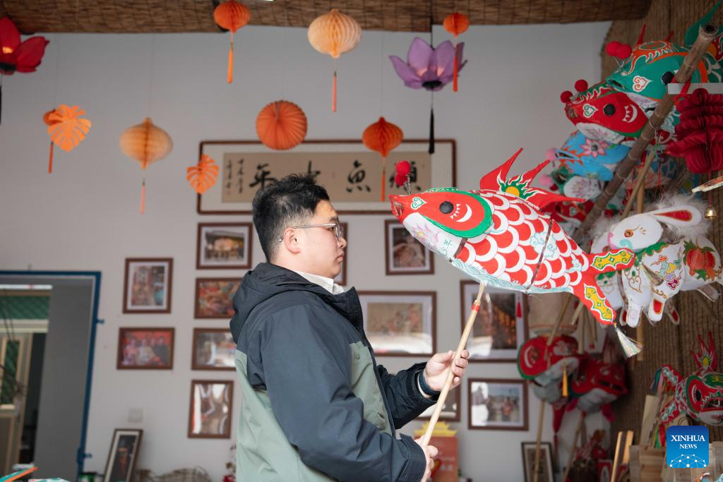 A craftsman displays his fish-shaped lantern at Zhanqi Village in Shexian County of Huangshan City, east China's Anhui Province, Jan. 6, 2025. (Xinhua/Zhang Duan)