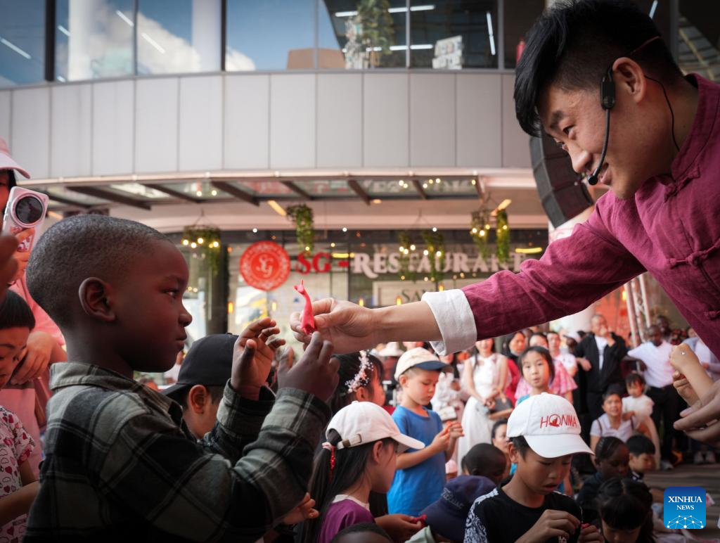 An artist interacts with a child during a dough figurine performance at a Chinese New Year gala held in Nairobi, Kenya, Jan. 19, 2025. (Xinhua/Li Yahui)