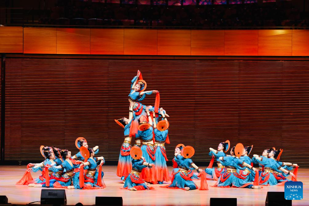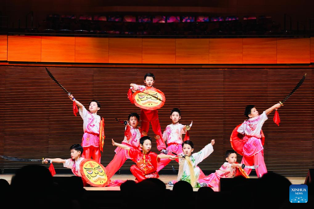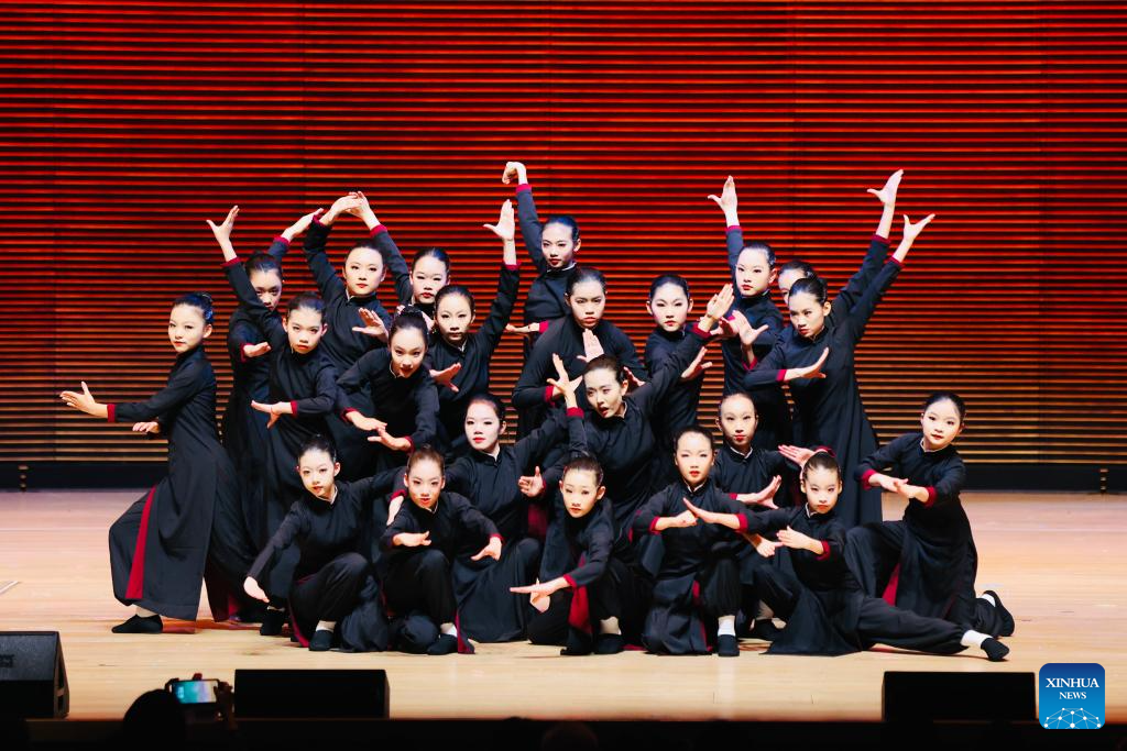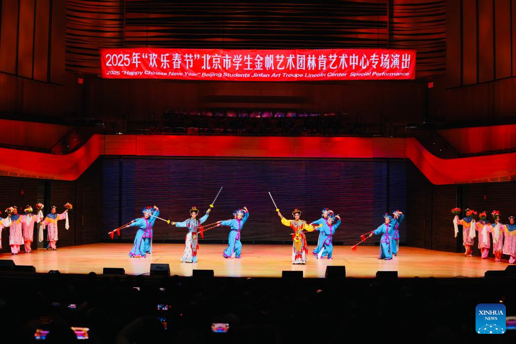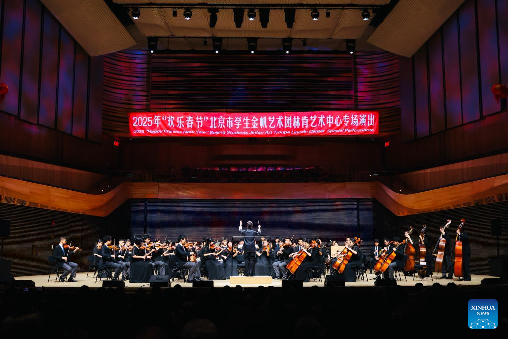 Chinese students from the Beijing Jinfan Youth Art Troupe perform at the Lincoln Center in New York City, the United States, on Jan. 20, 2025. About 400 students from the Beijing Jinfan Youth Art Troupe and the United Nations International School Band on Monday night joined hands to deliver a spectacular performance at the Lincoln Center in New York City and mark the Spring Festival which falls on Jan. 29 this year. (Xinhua)
