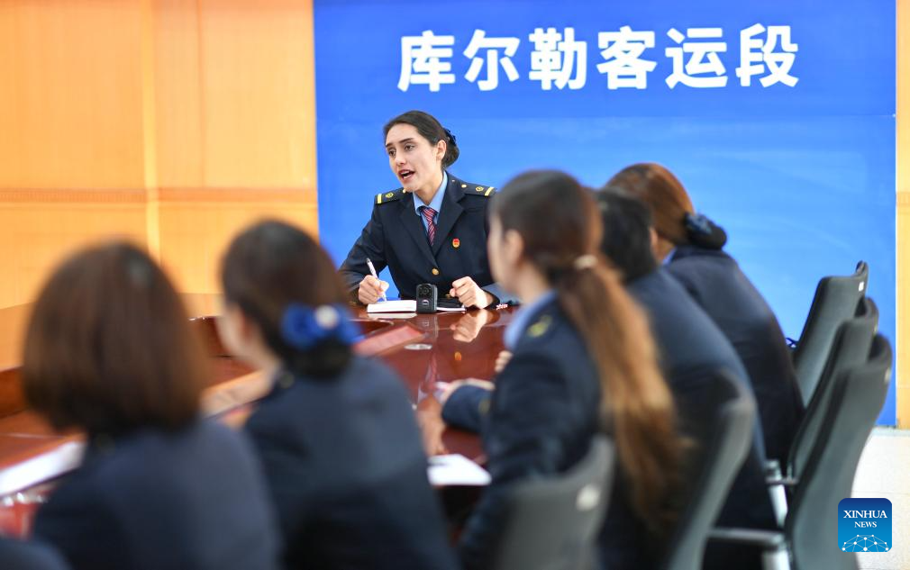 Train conductor Airkir Duliki arranges a vocational study in Korla, northwest China's Xinjiang Uygur Autonomous Region, Jan. 15, 2025. (Xinhua/Hu Huhu)