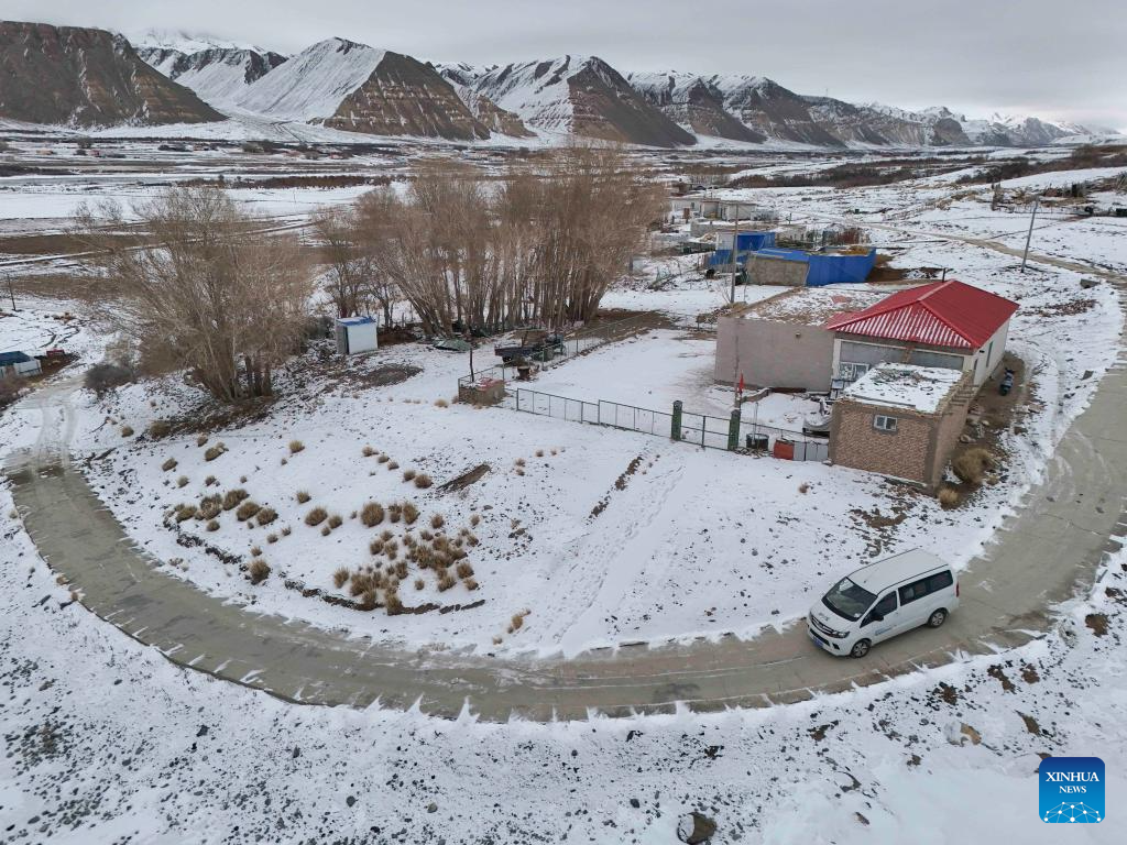 An aerial drone photo taken on Jan. 4, 2025 shows Airkir Duliki taking a car and returning to work in Xiabuzikla Village of Waqa County, Taxkorgan Tajik Autonomous County, northwest China's Xinjiang Uygur Autonomous Region. (Xinhua/Hu Huhu)