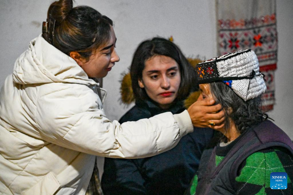Airkir Duliki's sister sweeps the tears of Duliki's grandmother before Duliki leaves home in Xiabuzikla Village of Waqa County, Taxkorgan Tajik Autonomous County, northwest China's Xinjiang Uygur Autonomous Region, Jan. 4, 2025. (Xinhua/Chen Shuo)