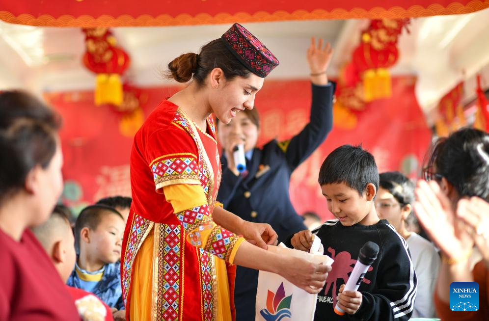 Train conductor Airkir Duliki presents a gift to a child during a Spring Festival gala on the train linking Kashgar of northwest China's Xinjiang Uygur Autonomous Region and Chengdu of southwest China's Sichuan Province, Jan. 16, 2025. (Xinhua/Hu Huhu)