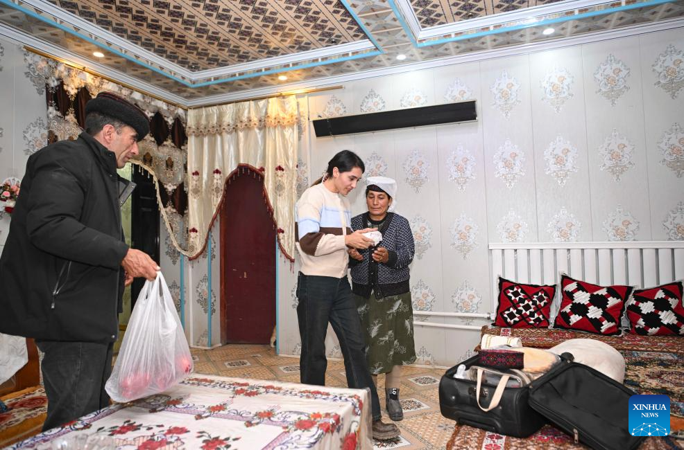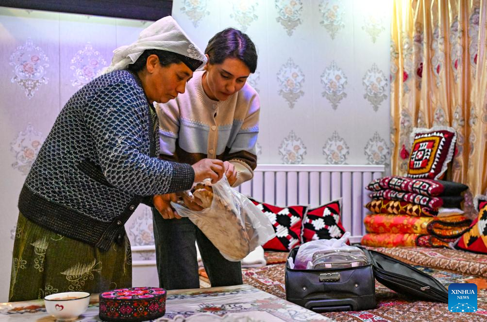 Airkir Duliki (C) packs food that her mother (R) made before leaving home in Xiabuzikla Village of Waqa County, Taxkorgan Tajik Autonomous County, northwest China's Xinjiang Uygur Autonomous Region, Jan. 3, 2025. (Xinhua/Hu Huhu)