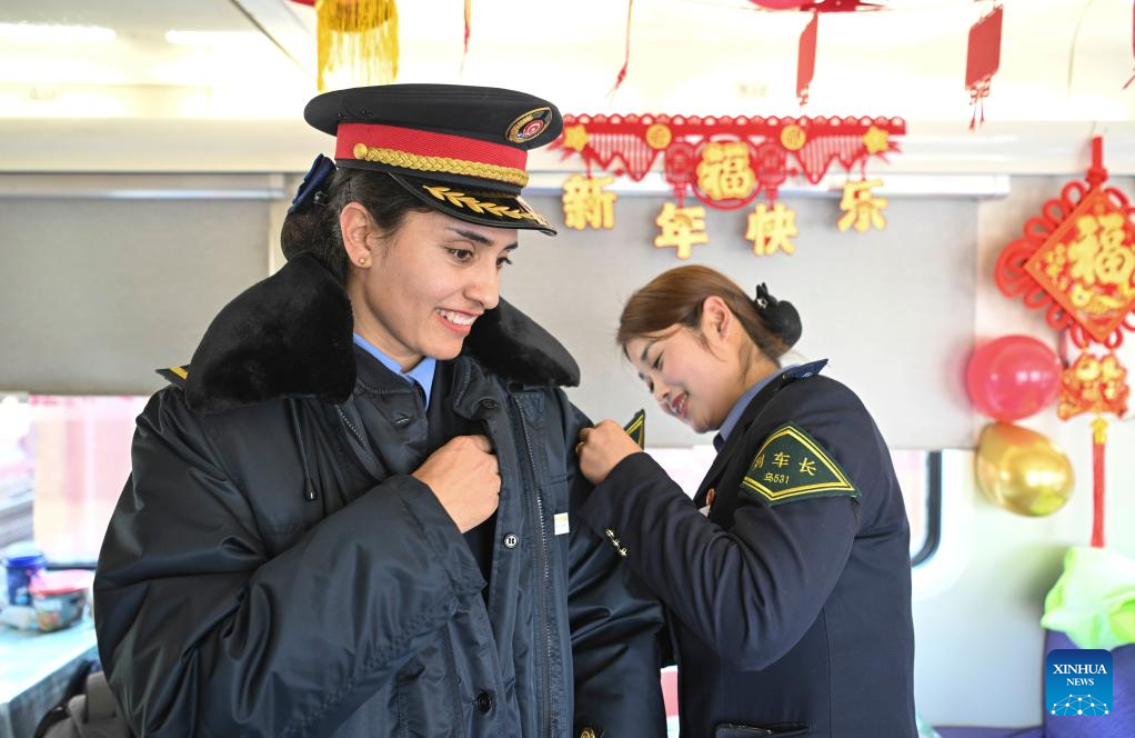 Train conductor Airkir Duliki (L) prepares for her shift on the train linking Kashgar of northwest China's Xinjiang Uygur Autonomous Region and Chengdu of southwest China's Sichuan Province, Jan. 16, 2025. (Xinhua/Hu Huhu)