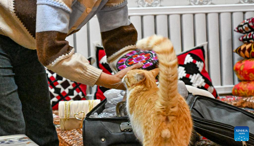 Airkir Duliki packs a hat that her mother made before leaving home in Xiabuzikla Village of Waqa County, Taxkorgan Tajik Autonomous County, northwest China's Xinjiang Uygur Autonomous Region, Jan. 3, 2025. (Xinhua/Chen Shuo)